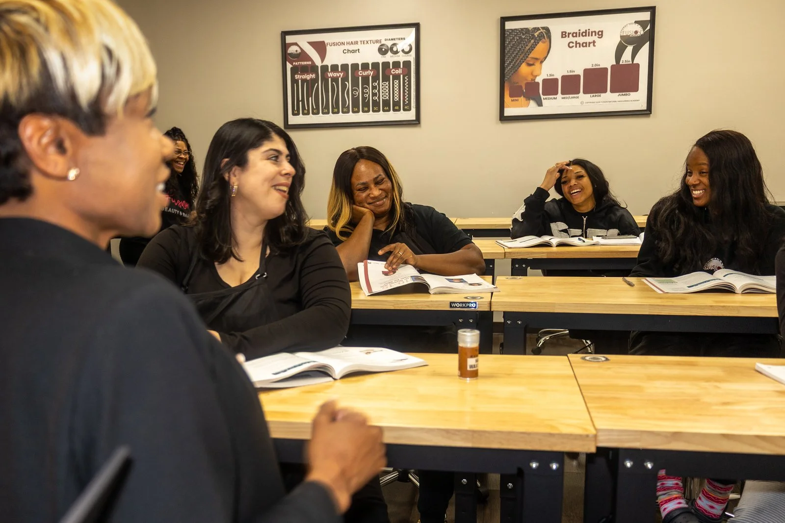Photo Caption: Fusion Beauty Academy students look on as Drake lectures and demonstrates technique.