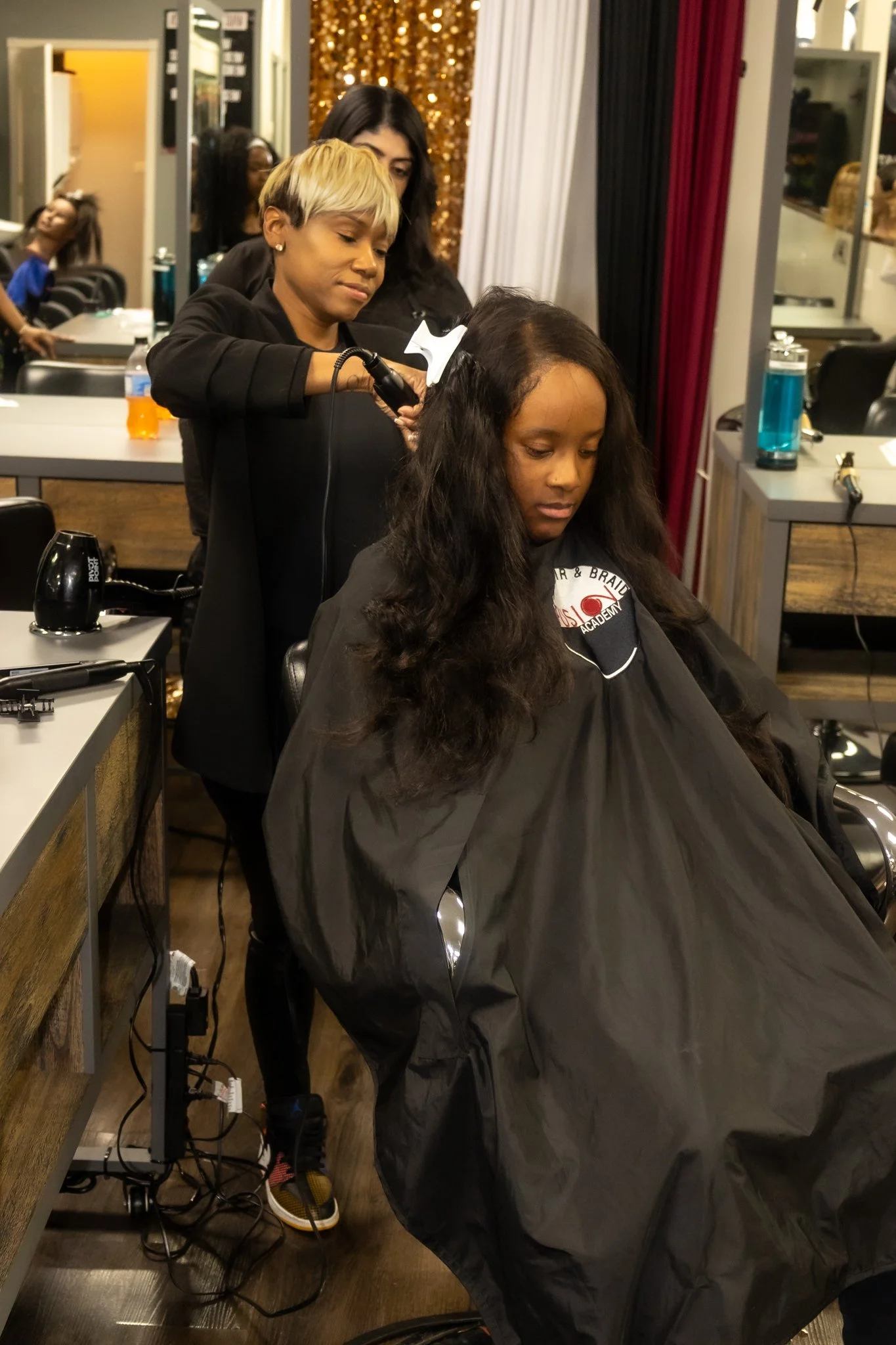 There weren’t braiding-specific licenses in 2009, so Drake attended cosmetology school, first to obtain a license and then to pursue a teaching degree. She continued to hone her braiding knowledge through salon work and trade shows until, in 2016 she opened her own brick and mortar: Luv’le Style Salon. Over the past decade, she hasn’t slowed down. After the salon, she created a haircare line and in 2023 she realized a long-held dream: opening her own braiding school.